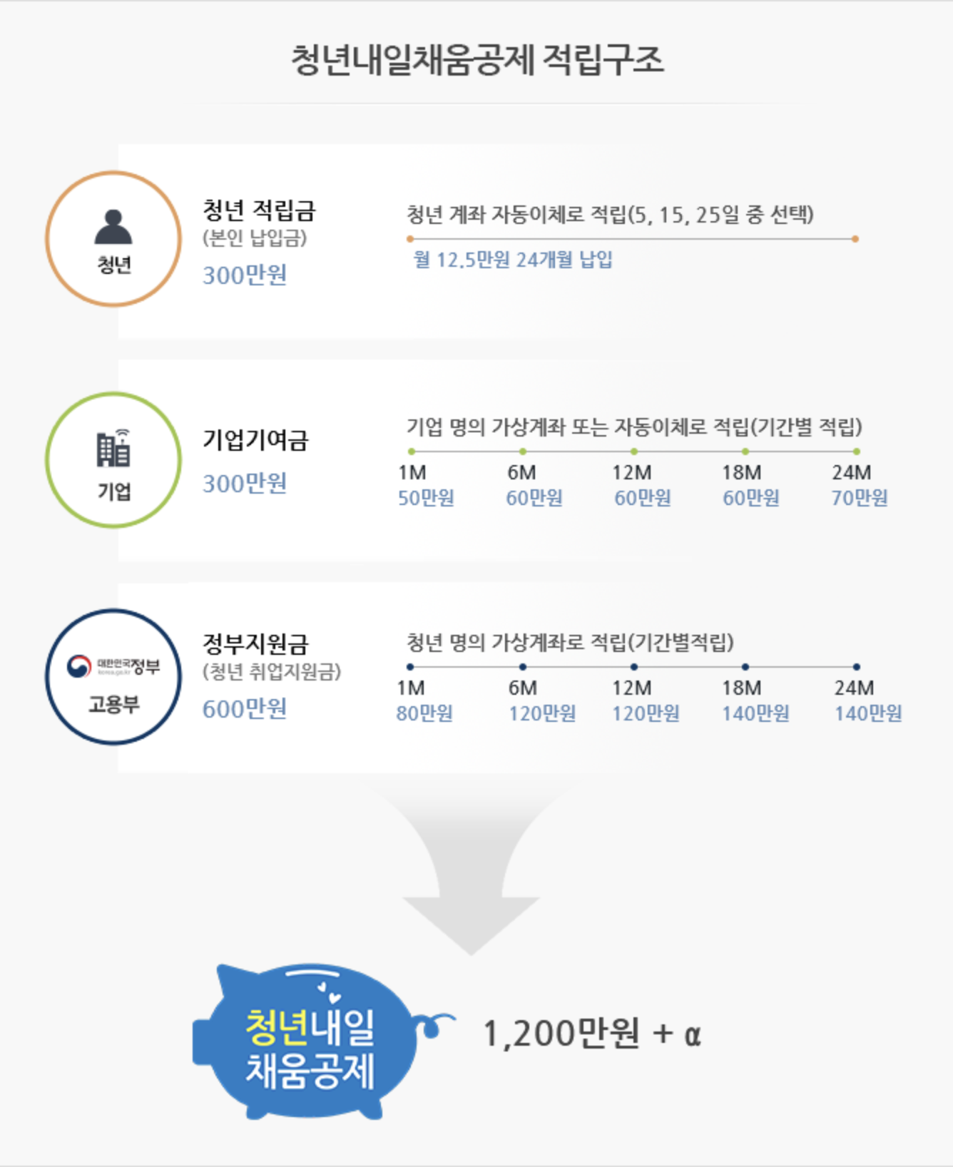 - 정부지원금(청년 취업지원금)은 총600만원 납일을 하며, 청년 명의 가상계좌로 적립을하게됩니다.(기간별적립)