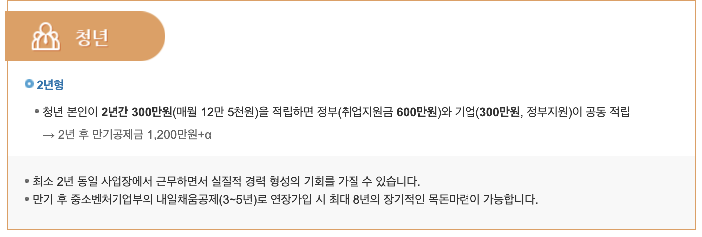 중소기업과 중견기업에서 정규직으로 취업한 청년들에게 장기근속을 위하여 고용노동부와 중소벤처기업부가 공동으로 운영하는 사업의 일종입니다. 청년/기업/정부가 공동으로 공제금을 적립하여 2년 근속한 청년들에게 성과보상금 형태로 만기종제금을 지급하는 제도입니다.