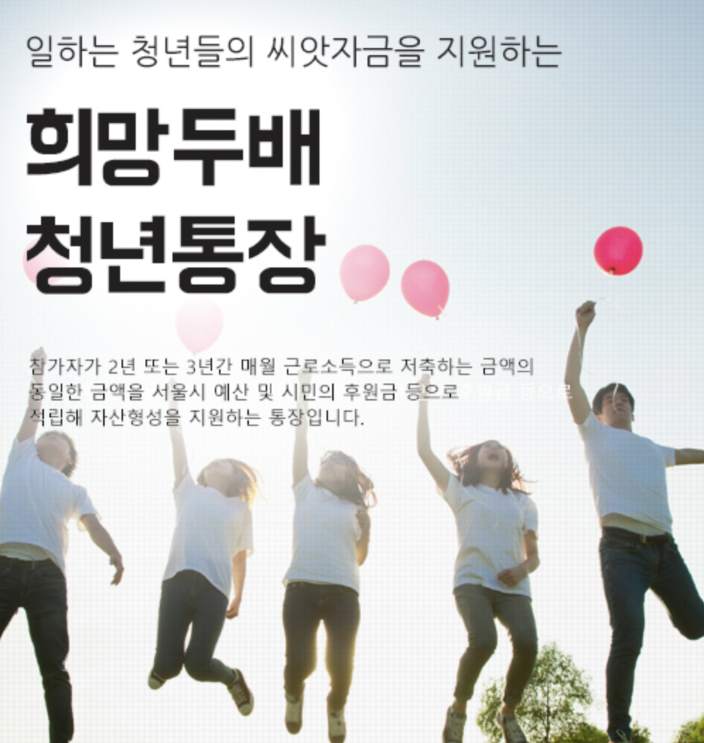 참가를 원하는 청년들이 2년 또는 3년 동안 매월 근로소득을 저축을 하는 금액과 같은 금액을 대한민국 서울시의 예산 그리고 시민의 후원금을 통해서 적립 지원하여 도움을 주는 통장을 희망 두배 청년통장이라고 부릅니다.