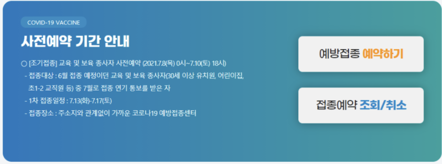 [ 예방접종센터 예약은 7월 21일 수요일 20시부터 7월 24일 토요일 18시]