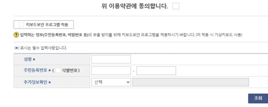 그럼 위 사진과 같이 이용약관에 동의를 한 후, 필수 입력랸에는 성명, 주민등록번호, 추가 정보 확인까지 진행을 한 후 기재하고 조회를 눌러주시면 됩니다.