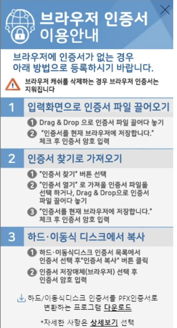 [드래그 앤 드롭]을 통해 파일 끌어다 놓은 후 인증서를 현재 브라우저에 저장한 후 체크하고 인증서 암호 입력