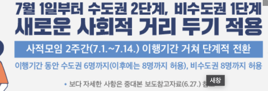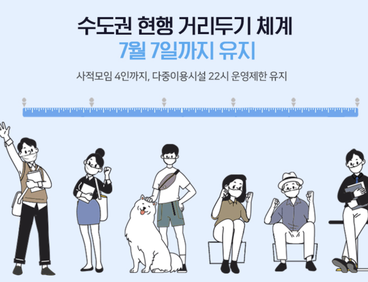 코로나 바이러스의 확산이 청/장년층에서 감염이 크게 증가하고 있기에 7월 1일부터 방역과 일상의 균형을 위해 사회적 거리두기 연장됩니다. 수도권은 사회적 거리두기 개편안은 적용이 1주일(7/1~ 7/7) 유예될 것이며, 5인 이상 사적 모임도 당연히 금지하게 됩니다.