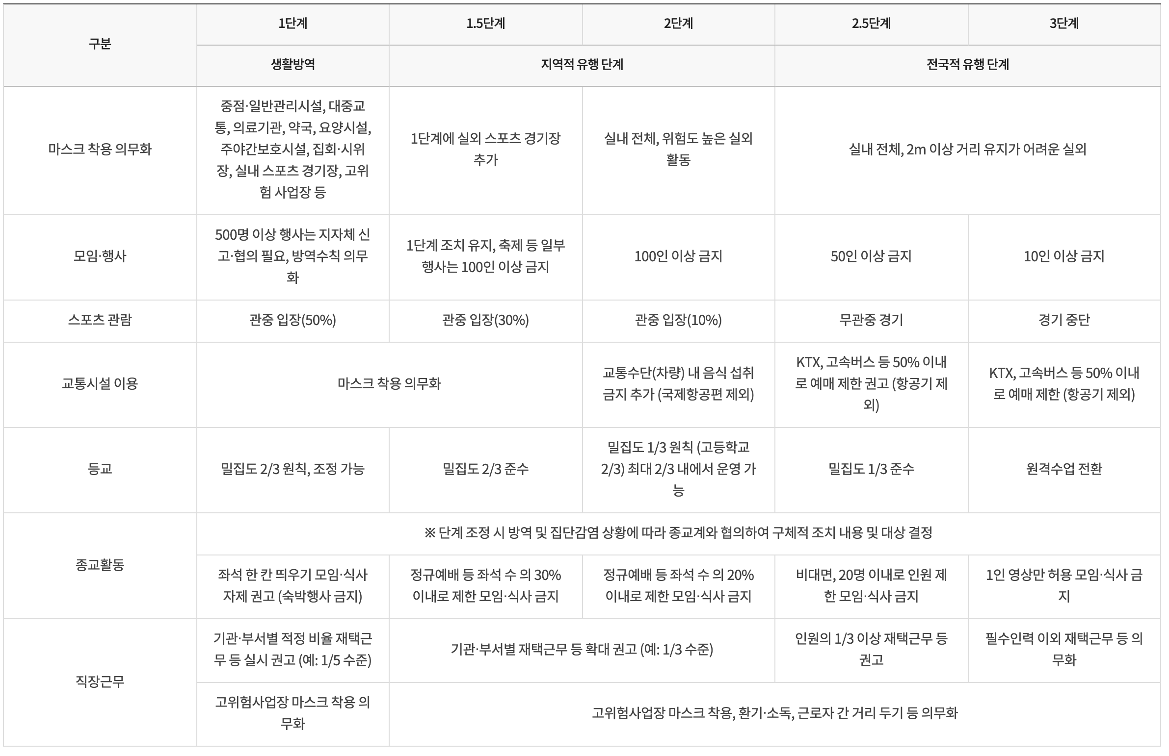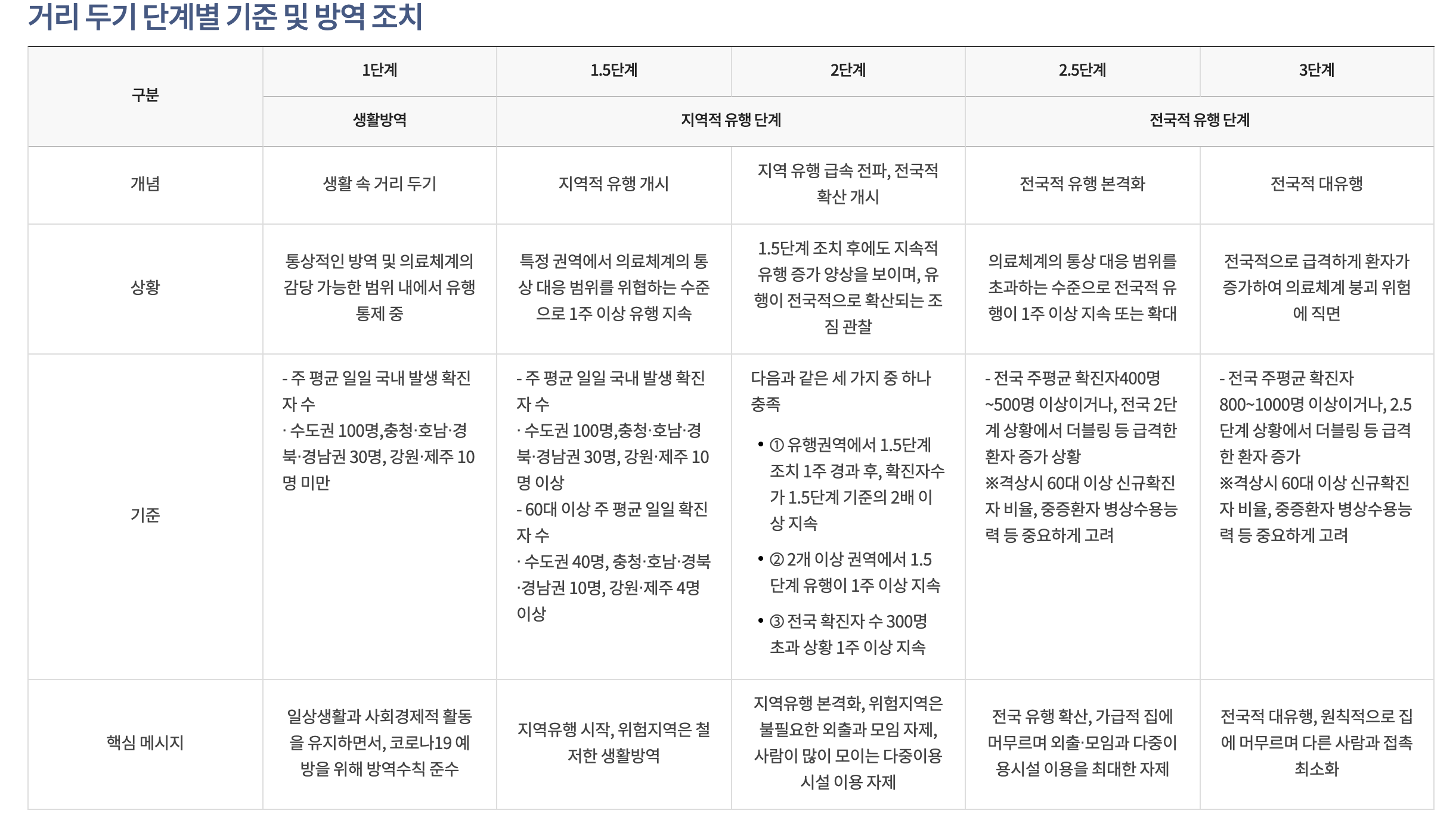 <사회적 거리두기 연장 단계별 기준 및 방역 조치>