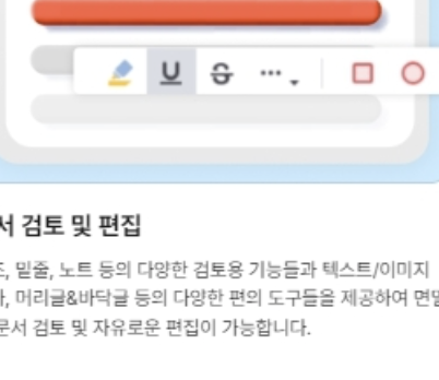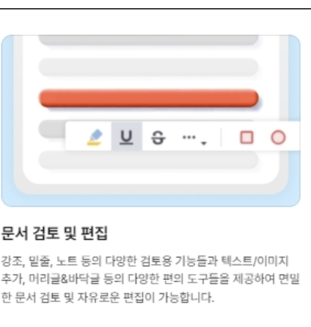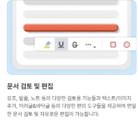 강조, 밑줄, 노트 추가 등 다양한 검토용 기능과 텍스트/이미지 추가, 머리글&바닥글 편집 등이 가능합니다.