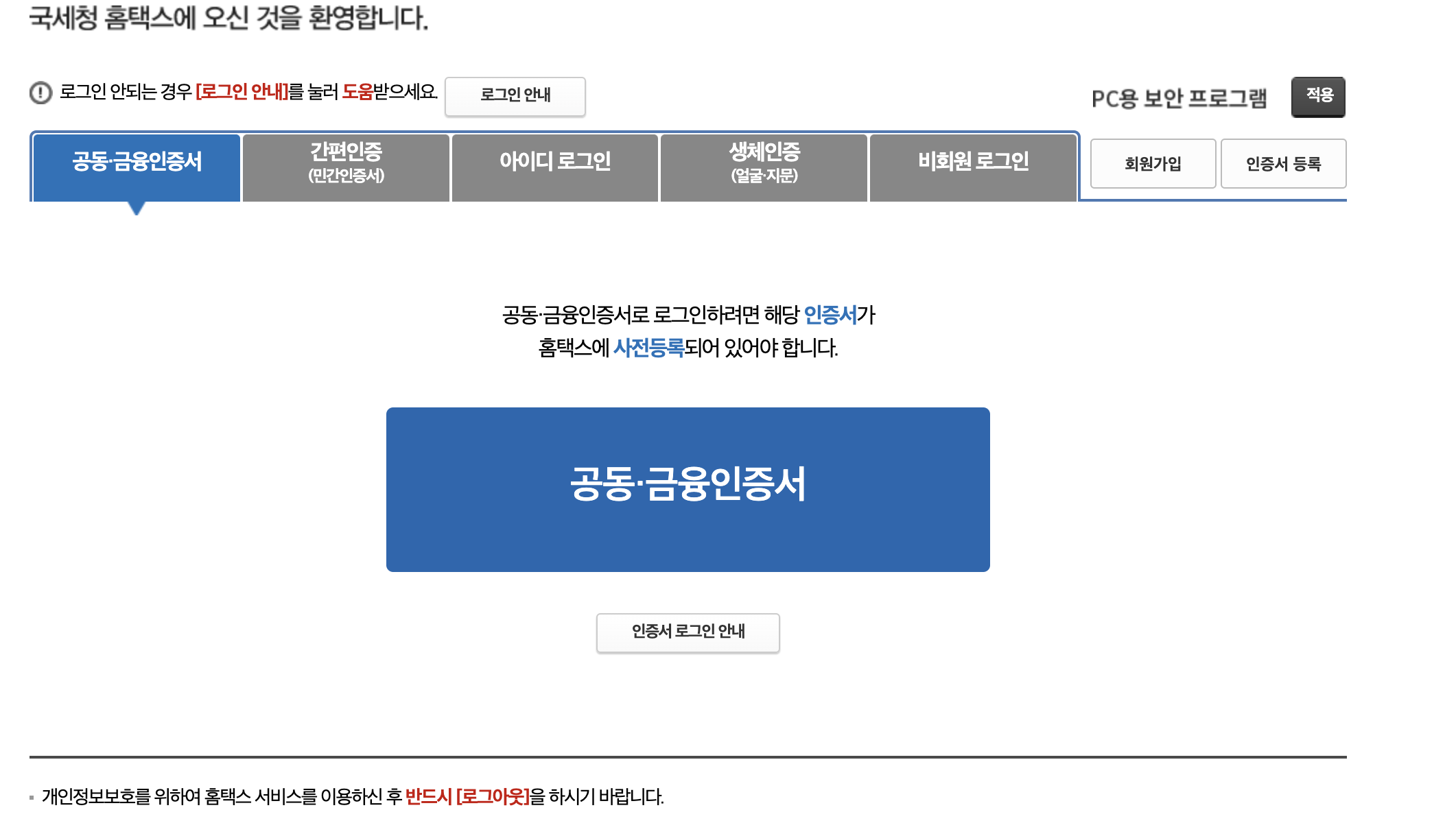 2. 사이트 방문 후 공동 및 금융인증서 및 간편 인증서를 통해 로그인을 진행해주시면 됩니다.