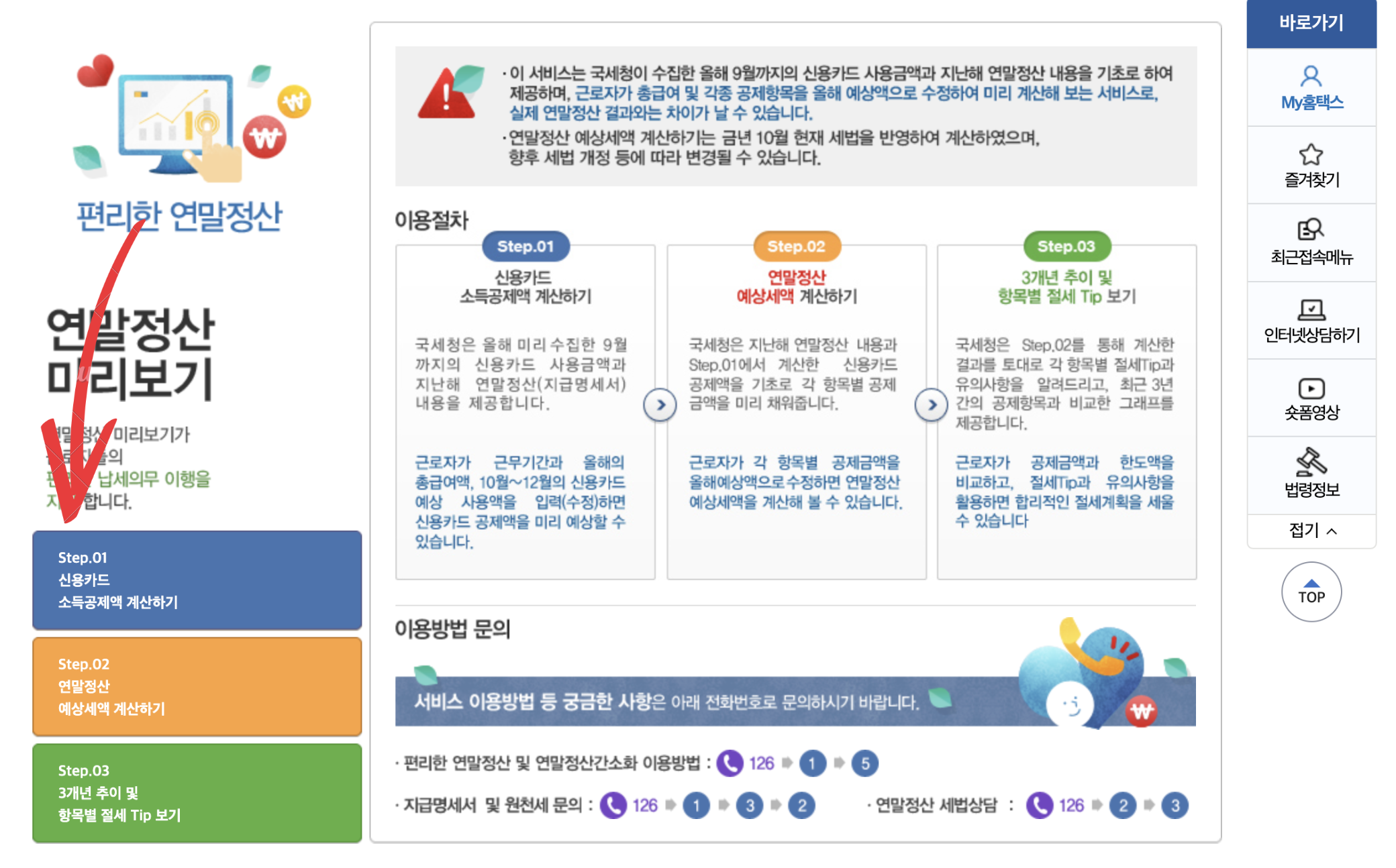 6. 아래 사진과 같이 Step 01. 소득공제액 계산하기를 눌러 진행해주시면 됩니다.