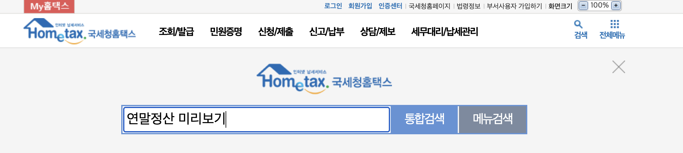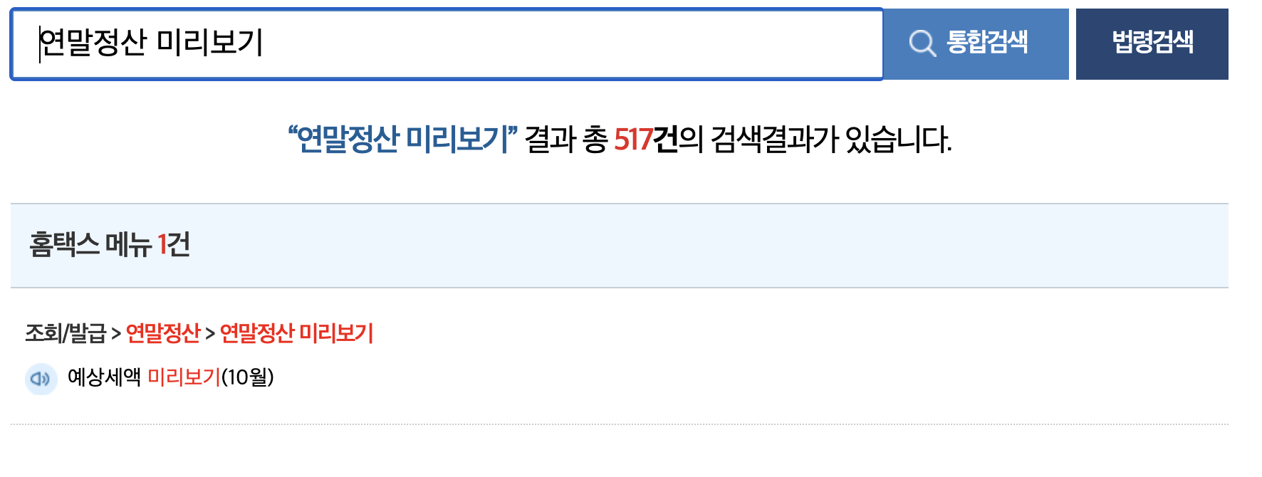 4. 검색 창에서 '연말정산 미리보기'를 검색해주시면 됩니다.