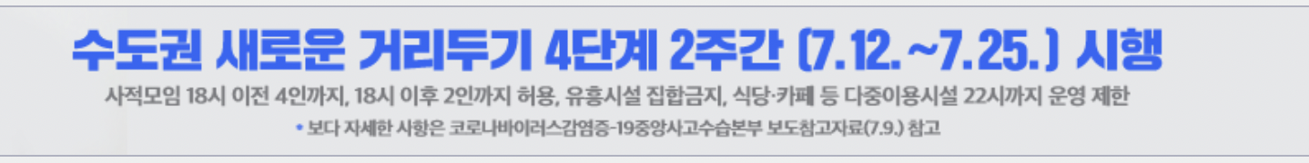 현재 수도권에서는 4일간 천명이 넘는 확진자가 나오고 있어, 거리두기 4단계를 시행할 예정입니다. 시행하는 날짜는 7월 12일부터 7월 25일까지 적용이 될 예정입니다. 사적인 모임은 18시 이전 4