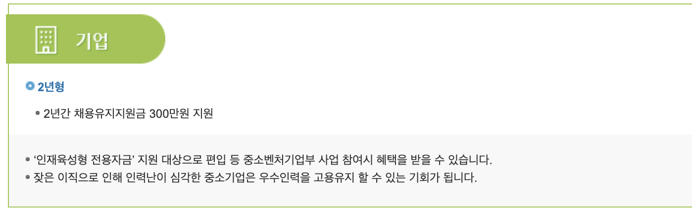 기업은 2년간 채용유지지원금을 300만원 지원을 받을 수 있습니다. 또한 인재육성형 전용자금에 대한 지원 대상으로 편입과 같은 중소벤처기업부 사업 참여시 혜택을 받을 수 있습니다.