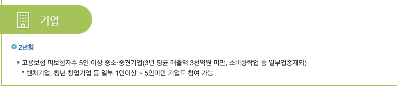 기업은 2년형일 경우 고용보험 피보험자수 5인 이상 중소기업과 중견기업에서만 가능합니다. 그리고 벤처기업과 청년 창업기업 등 일부 1인이상에서 5인미안 기업도 참여가 가능합니다.
