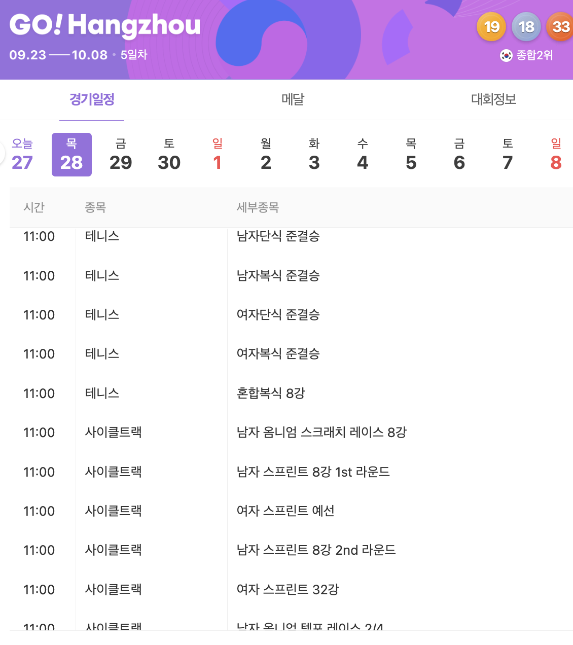 항저우 아시안 게임 9월 28일 일정