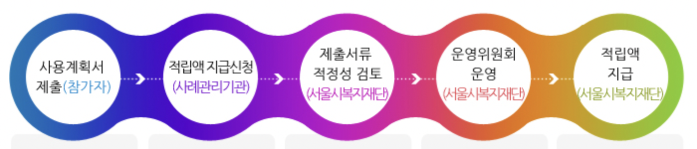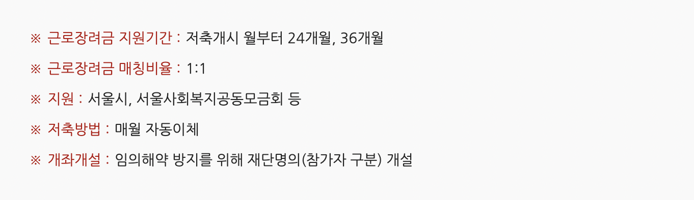 근로 장려금 지원기간은 저축 개시 월로부터 2년과 3년을 선택을 하게 되며, 저축하는 본인이 투자하는 금액과 동일한 금액을 매칭 하게 됩니다. 지원을 받게 되는 기관은 서울시, 서울사회복지 공동모금회에서 지원을 해주며, 매월 자동이체를 통해 간편하게 입금을 할 수 있습니다.