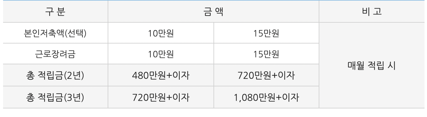 본인 저축액은 10만 원과 15만 원을 선택을 할 수 있습니다. 근로 장려금은 본인 저축액과 동일한 금액을 받게 됩니다. 본인 저축액이 10만원일 경우 근로장려금은 10만원, 본인 저축액이 15만원일 경우 15만원을 받게 됩니다. 2년동안 10만원 저축을 선택할 시에는 480만원 + 이자를 얻게되며, 15만원 저축을 선택하게 될 경우, 720만원+이자를 받게 됩니다. 3년동안 10만원을 저축을 하게 될 경우, 720만원+이자를 받으며, 15만원을 적립하게 될 경우 1080만 원+이자를 받게 됩니다.