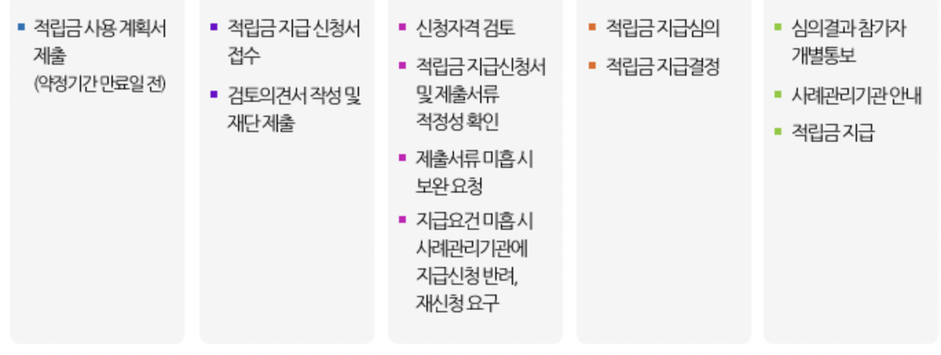 • 적립기간 완료 후 5년 경과 시까지 근로장려금 미신청 및 지급심사가 불결된 경우 근로장려금은 지급하지 않고 재단에서 여입 처리합니다.