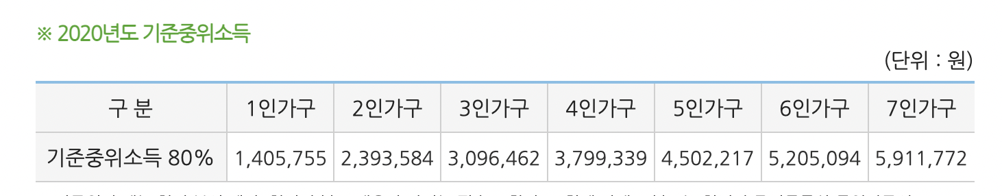 • 부양의무자[부모님과 배우자] 소득인정액 기준 중위소득 80% 이하일 경우